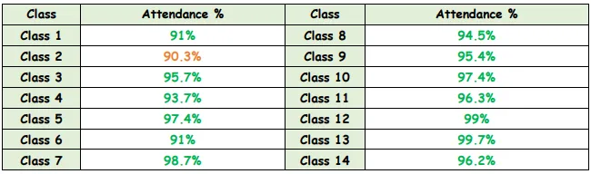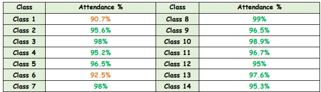 - Within a year group classes compete against each other to earn a letter for every day that the class attendance is 100% to complete the slogan ‘Everyday Counts!’ The class who completes this first receives a reward.